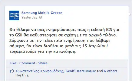 “Καλησπέρα σας.Αρχικά θα θέλαμε να ζητήσουμε συγγνώμη, από όλους εσάς που η καθυστέρηση στην αναβάθμιση ICS για το GALAXY S II έχει προκαλέσει τα οποιαδήποτε προβλήματα.Καθώς από χώρα σε χώρα υπάρχουν διαφορές, θέλουμε να σας ενημερώσουμε πως κάνουμε ότι είναι δυνατό, για να βγεί η έκδοση αυτή και στην Ελλάδα χωρίς προβλήματα.Στόχος μας είναι να έχετε την αναβάθμιση μέσα στην επόμενη εβδομάδα.Ευχαριστούμε πολύ για την υπομονή και την κατανόησή σας!”