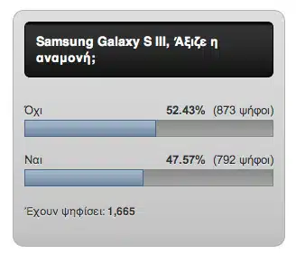 Το Samsung Galaxy S III είναι εδώ και τις επόμενες ημέρες το Techblog σας ετοιμάζει κάτι πολύ δυνατό! Έως τότε δείτε παρακάτω τα αποτελέσματα της δημοσκόπισης που τρέξαμε την προηγούμενη εβδομάδα και συνολικά ψηφίσατε 1665 φίλοι της τεχνολογίας. Μοιρασμένα τα ποσοστά για το αν άξιζε η όχι η αναμονή. Αν υπολογίσουμε ότι το “Όχι” ψήφισαν […]