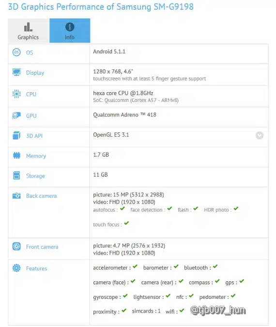 Το Samsung SM-G9198 εμφανίστηκε στη βάση δεδομένων του GFX Benchmark με οθόνη 4.6 ιντσών HD (1280×768), εξαπύρηνο επεξεργαστή Snapdragon 808 (2x Cortex-A57 και 4x Cortex-A53), τον οποίο φοράει και το LG G4, Adreno 418 GPU και μνήμη RAM 2GB. Έχει κάμερα 16 Megapixel και δεύτερη κάμερα 5 Megapixel. Το νέο Samsung τρέχει Android 5.1.1 Lollipop, […]