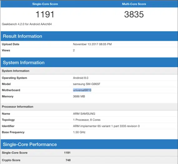 Αναλυτικά, μια συσκευή με κωδική ονομασία SM-G965F αναρτήθηκε στο Geekbench, αποκαλύπτοντας μερικά από τα τεχνικά της χαρακτηριστικά. Τα πολυαναμενόμενα Galaxy S9 / S9+ θα έχουν κωδικούς G960 και G965 αντίστοιχα, κάτι που σημαίνει πως το κινητό στο Geekbench είναι κάποιο μοντέλο δοκιμής (του S9+) της Samsung, στην περίπτωση πάντα που δεν πρόκειται για ψεύτικη ανάρτηση. Ενώ η λίστα συμφωνεί με την ενσωμάτωση του πανίσχυρου νέου επεξεργαστή Exynos 9810 στο S9, αναφέρει επίσης πως, τουλάχιστον το S9+, θα ενσωματώνει 4GB RAM.