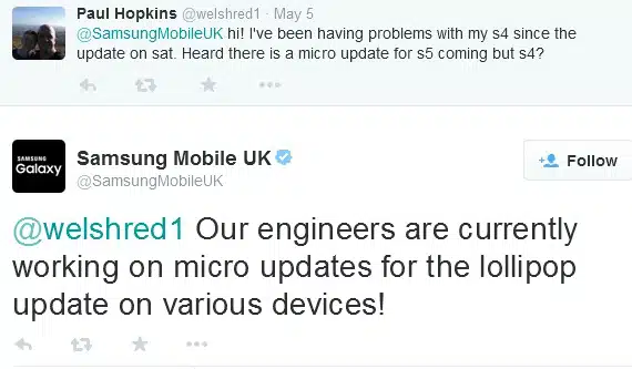 Αν όμως έχετε κάποια από τις αναβαθμισμένες σε Lollipop συσκευές της Samsung, τότε σύντομα τα προβλήματα θα λυθούν μέσω micro-updates που ετοιμάζει. Η είδηση έρχεται μέσω του Twitter και της Samsung UK. Τα minor bug fixes θα σταλούν σε διάφορα μοντέλα τα οποία είχαν προβλήματα αφού αναβαθμίστηκαν σε Android 5.0. Ωστόσο το tweet δεν διευκρινίζει πότε θα ξεκινήσουν να έρχονται τα updates.