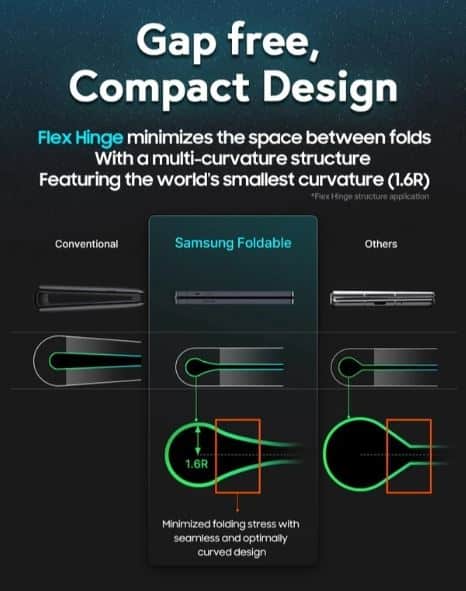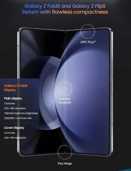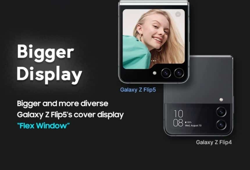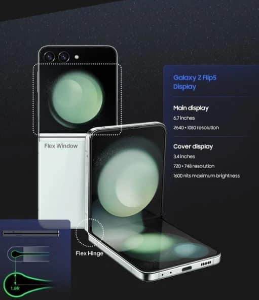 Το infographic δείχνει επίσης πώς το νέο flex hinge δημιουργεί μια συμπαγή σχεδίαση χωρίς κενά. Και υπογραμμίζει επίσης τη νέα εξωτερική οθόνη 3,4 ιντσών για το Galaxy Z Flip 5.
