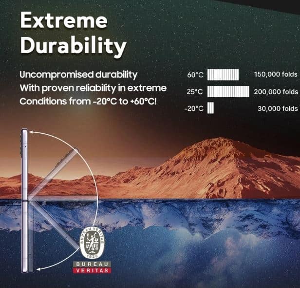 Ένα infographic που κυκλοφόρησε από τη Samsung αποκαλύπτει ότι στους 77 βαθμούς Φαρενάιτ (25 βαθμούς Κελσίου), μπορείτε να περιμένετε να πάρετε 200.000 foldαρίσματα από το Samsung Galaxy Z Fold 5 και το Samsung Galaxy Z Flip 5.