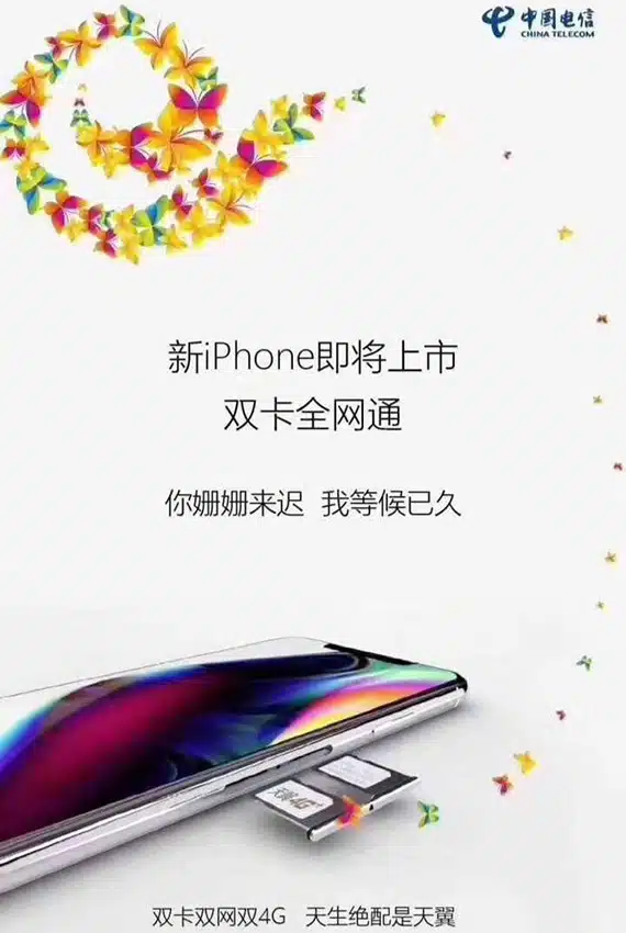 Δύσκολα κάποιος θα πίστευε πως η Apple θα κυκλοφορήσει iPhone με δύο κάρτες sim, κάτι το οποίο ενδεχομένως να είναι υπαρκτό σενάριο με τόσες διαρροές που έχουν γίνει, όπως αυτή της China Telecom όπου το “καλωσορίζει” μέσω teaser poster.