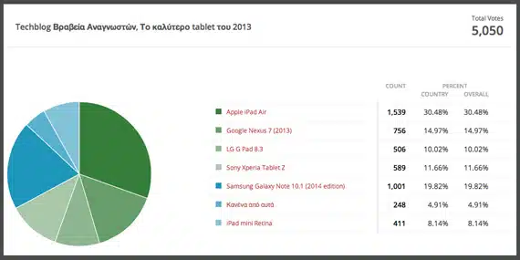 Ψηφίζω σαν καλύτερο smartphone το LG G2 όχι γιατί υπερισχύει από τα υπόλοιπα (κάποιο έχει κάτι άλλο καλύτερο από κάποιο άλλο) αλλά σαν σχέση ποιότητας τιμής (value for many) όσο για την ψήφο μου στο ipadair tablet λόγο του οτι έχω δοκιμάσει αρκετά android tablet πιστεύω οτι το ios δεν μπορεί να συγκριθεί με το android και φυσικά διαθέτει πολύ περισσότερα apps έναντι του android ο λόγος , φτηνότερο κόστος ανάπτυξης για ios έναντι του κόστους ανάπτυξης για android.
