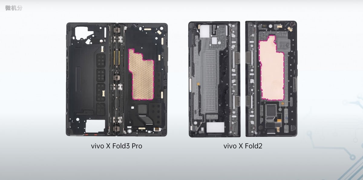 Το teardown συνεχίζεται με τη μητρική πλακέτα που φιλοξενεί το τσιπ Snapdragon 8 Gen 3, τη Samsung LPDDR5X RAM και τις μονάδες αποθήκευσης UFS 4.0 καθώς και το τσιπ απεικόνισης vivo V3. Υπάρχει ένας vapor chamber χαλκού ακριβώς κάτω από την πλακέτα για τον έλεγχο της θερμότητας. Στη συνέχεια βλέπουμε από κοντά τα ηχεία, τα μικρόφωνα και τον κινητήρα δόνησης, καθώς και τη μπαταρία ανόδου σιλικόνης διπλής κυψέλης 5.700 mAh, η οποία χωρίζεται σε δύο κυψέλες 2.850 mAh. Το X Fold 3 Pro φαίνεται ότι έχει μικρότερο θάλαμο ατμού VC από τον προκάτοχό του.