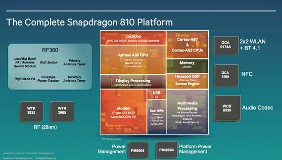Ο Snapdragon 810 μαζί με τον κατώτερό του Snapdragon 808, είναι δυο πολύ ενδιαφέρουσες προσθήκες στη συλλογή της Qualcomm, χρησιμοποιεί ARM big.LITTLE αρχιτεκτονική με 4 Cortex-A57 πυρήνες και 4 Cortex-A53. Το chip αλλάζει μεταξύ Cortex-A57 και Cortex-A53, επιτυγχάνοντας έτσι καλή ισορροπία μεταξύ κατανάλωσης και αποδοτικότητας.