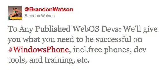 Ποιος ξέρει μπορεί να κυκλοφορήσουν και κάποια αξιόλογη εφαρμογή. Βέβαια η πλειονότητα των προγραμματιστών αυτών είναι λογικό να στραφεί σε άλλη πλατφόρμα. Η Microsoft δηλώνει παρόν και προσκαλεί ή καλύτερα περιμένει με ανοιχτές αγκάλες τους “προδομένους” προγραμματιστές του WebOS να ασχοληθούν με την ανάπτυξη εφαρμογών για τα δικά της Windows Phone. Επίσης η Microsoft θα παρέχει δωρεάν εκπαίδευση, εργαλεία ανάπτυξης εφαρμογών αλλά και συσκευές στους προγραμματιστές.
