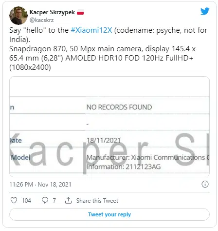 Οι φήμες για τη σειρά Xiaomi 12 συσσωρεύονται εδώ και σχεδόν μισό χρόνο και έχουμε μια καλή ιδέα για το τι να περιμένουμε από τα Xiaomi 12 και 12 Ultra. Ωστόσο, φαίνεται ότι ένα τρίτο μέλος συμμετέχει στην ομάδα. Ο γνωστός πληροφοριοδότης της MIUI, Kacper Skrzypek, κατάφερε να ανακαλύψει μία λίστα πιστοποίησης IMEI για το Xiaomi 12X. Η συσκευή έχει την κωδική ονομασία Psyche και φέρει τον αριθμό μοντέλου 2112123AG.