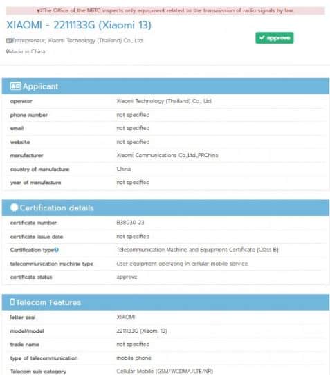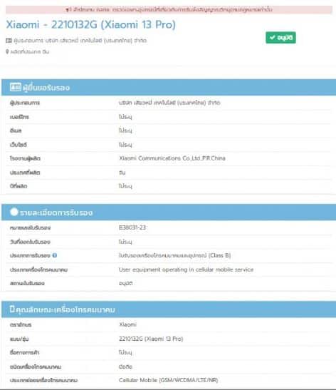 Η παγκόσμια έκδοση του Xiaomi 13 Pro έχει εντοπιστεί τόσο στη βάση δεδομένων του Bureau of Indian Standards (BIS), όσο και στο Thai NBTC. Ο αριθμός μοντέλου γι’ αυτή τη συσκευή είναι 2210132G. Όσο για το Xiaomi 13, αυτό πιστοποιήθηκε από την NBTC, φέροντας τον αριθμό μοντέλου 2211133G.