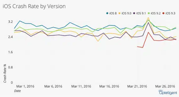 Όμως, η έρευνα της Apteligent δείχνει ότι σε σύγκριση με τις προηγούμενες εκδόσεις ο ρυθμός που κρασάρει το iOS 9.3 είναι μικρότερος και αναφέρει ότι αυτή είναι η πιο σταθερή έκδοση που έχει κυκλοφορήσει τελευταία η Apple.