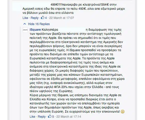 iSquare:“Καλησπέρα, η διαμόρφωση της τιμής των προϊόντων βασίζεται πάντοτε στην αντίστοιχη τιμολογιακή πολιτική της Apple. Θα πρέπει να σημειωθεί ότι οι τιμές που περιλαμβάνονται στο ηλεκτρονικό κατάστημα της Αμερικής δεν περιλαμβάνουν φόρους, άρα δεν μπορούν να είναι συγκρίσιμες με τις ευρωπαϊκές τιμές. Η iSquare προσπαθεί να προσφέρει τα προϊόντα που διανέμει σε επίπεδο τιμών αντίστοιχο με τα Ευρωπαϊκά καταστήματα της Apple. Τα προϊόντα της Apple πωλούνται με διαφοροποιημένες τις τιμές τους ακόμα και ανάμεσα στα ηλεκτρονικά καταστήματα της ίδιας της Apple σε διάφορες χώρες. Οι μικρές διαφορές τιμών που προκύπτουν, μεταξύ της χώρας μας και κάποιων Ευρωπαϊκών καταστημάτων, οφείλονται σε έξοδα μεταφοράς, επιπλέον οφειλόμενα στη χώρα μας τέλη (π.χ. εισφορά ανακύκλωσης), αλλά κυρίως στον ιδιαίτερα υψηλό ΦΠΑ 23% που ισχύει στην Ελλάδα – από τους πλέον υψηλούς της Ευρώπης.