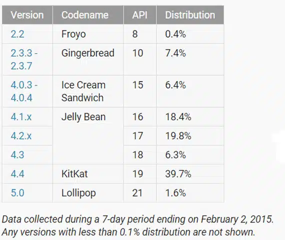 Στο επίσημο διάγραμμα της Google με τις εκδόσεις του λειτουργικού συστήματος Android κατάφερε επιτέλους να μπει η έκδοση 5.0 Lollipop, σύμφωνα με τα δεδομένα των τελευταίων 7 ημερών μέχρι και τις 2 Φεβρουαρίου του 2015. Στο διάγραμμα αυτό εμφανίζονται μόνο οι εκδόσεις του Android που βρίσκονται σε τουλάχιστον 0.1% των συσκευών οι οποίες ήταν ενεργές στις εφαρμογές Google Play.