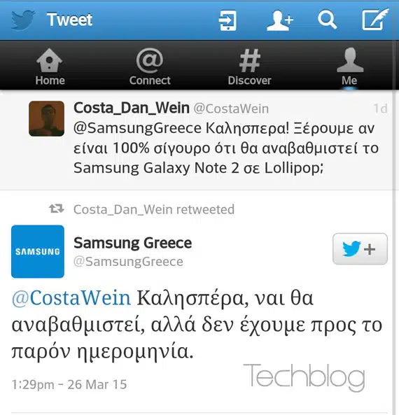Το Samsung Galaxy Note 2 θα αναβαθμιστεί σε Android Lollipop όπως επιβεβαιώνει η Samsung Greece μέσα από τον επίσημο λογαριασμό της στο Twitter απαντώντας σε ερώτηση καταναλωτή. Η Samsung δεν θέλησε να δώσει ημερομηνία για το πότε θα διατεθεί η αναβάθμιση, σίγουρα όμως αποτελεί μια καλή είδηση εφόσον επιβεβαιωθεί και δεν έχουμε κυβίστηση τους επόμενους […]