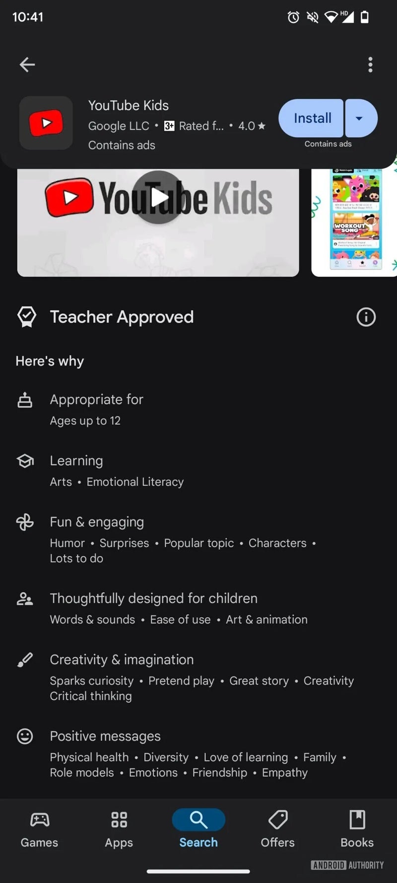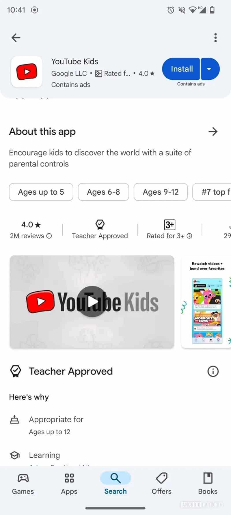 Τo header είναι γεμάτo με βασικές πληροφορίες σχετικά με την εφαρμογή, συμπεριλαμβανομένου του εικονιδίου, του ονόματος, του προγραμματιστή, της μέσης βαθμολογίας από το Play Store και του αν έχει διαφημίσεις. Θα υπάρχει επίσης το εύχρηστο κουμπί Εγκατάσταση για γρήγορες λήψεις απευθείας στη συσκευή σας, καθώς και ένα αναπτυσσόμενο μενού που σας επιτρέπει να εγκαταστήσετε την εφαρμογή στα άλλα gadget που έχετε στην κατοχή σας.