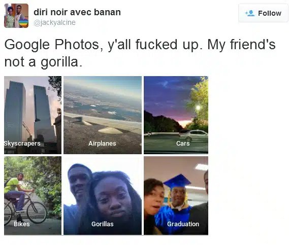 Το πρόβλημα που προέκυψε στην συγκεκριμένη περίπτωση όμως, είναι ότι ο προγραμματιστής Jacky Alciné όταν έβγαλε φωτογραφίες του ίδιου με την κοπέλα του, η εφαρμογή τους επεσήμανε ως “gorillas”. Ο ίδιος τουίταρε το πρόβλημα αναρωτώμενος τι είδους δείγματα έχει χρησιμοποιήσει η Google για να βγαίνουν τέτοιου είδους αποτελέσματα.