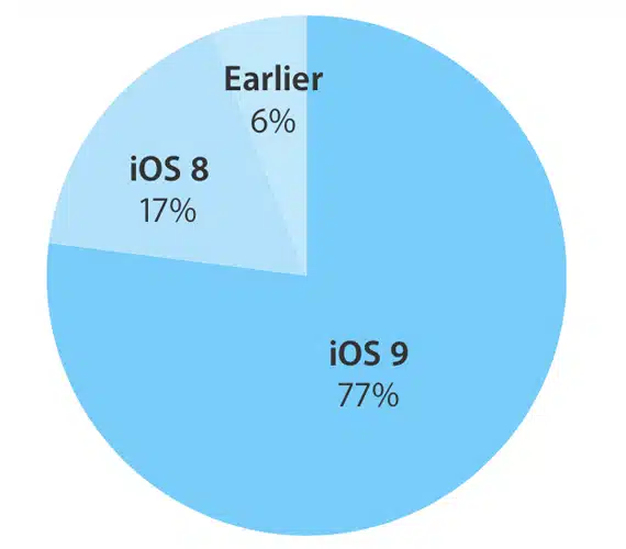 Ωστόσο, ο ρυθμός υιοθέτησής του είναι καλύτερος από του iOS 8, το οποίο κατάφερε να φτάσει στο 77% στα μέσα Μαρτίου του προηγούμενου έτους. Αυτή τη στιγμή το ποσοστό του iOS 8 είναι στο 17% ενώ το 6% των συσκευών τρέχει παλαιότερες εκδόσεις.