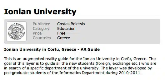 Πιστεύοντας πλήρως στις τεχνολογικές ανακατατάξεις που θα εισάγει το ερευνητικό πεδίο της επαυξημένης πραγματικότητας (augmented reality), φοιτητές του Μεταπτυχιακού προγράμματος της Πληροφορικής του Ιονίου Πανεπιστημίου δημιούργησαν μια από τις πρώτες εφαρμογές augmented reality για κινητό τηλέφωνο και την πρώτη εφαρμογή ελληνικού πανεπιστημίου.