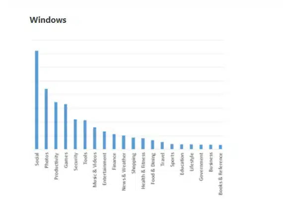 Όσον αφορά στις πιο δημοφιλείς κατηγορίες εφαρμογών τα Games είναι τα πιό δημοφιλή στο σύνολο. Όμως σε αναλογία με το πόσα apps είναι διαθέσιμα και πόσα επιλέγουν οι χρήστες να ατεβάσουν, τα παιχνίδια δεν βρίσκονται στην κορυφή της λίστας. Τα πιο δημοφιλή είναι η κατηγορία των Social apps και στη συνέχεια ακολουθούν τα Photos apps.