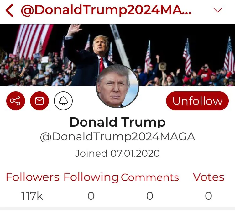 Ο Donald Trump λέγεται ότι δεν έχει ο ίδιος λογιαριασμό στο Parler, υπάρχει όμως ένα εκεί ένα προφίλ που δημιουργήθηκε προχθές με τα στοιχεία του και ήδη μετράει 117.000 ακόλουθους.