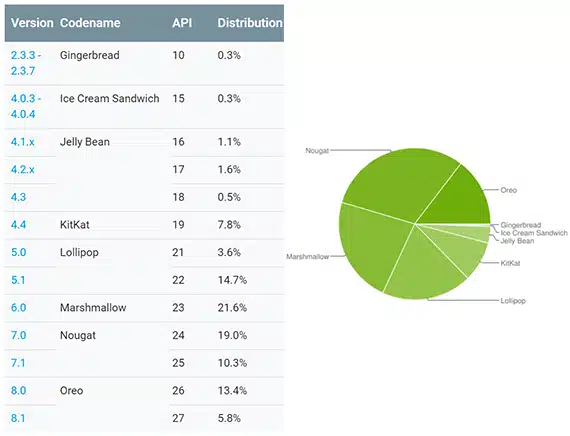 Όσον αφορά τις προηγούμενες εκδόσεις, το Android Nougat 7.0 και 7.1 μειώθηκε από το 30.8% στο 29.3%, δείχνοντας ότι είναι η έκδοση που βρίσκεται στα περισσότερα ενεργά smartphone, με τις εκδόσεις 7.0 και 7.1 να παρουσιάζουν μείωση. Ένα άλλο στοιχείο που παρατηρείται για άλλη μια φορά είναι πως το Android 9.0 Pie απουσιάζει από τα στατιστικά στοιχεία και αυτό πιθανόν να οφείλεται στο ότι η Google δεν εμφανίζει εκδόσεις Android που έχουν ποσοστό μικρότερο από 0.1%, με τη συγκεκριμένη έκδοση να βρίσκεται ακόμα σε μικρό αριθμό συσκευών παγκοσμίως.