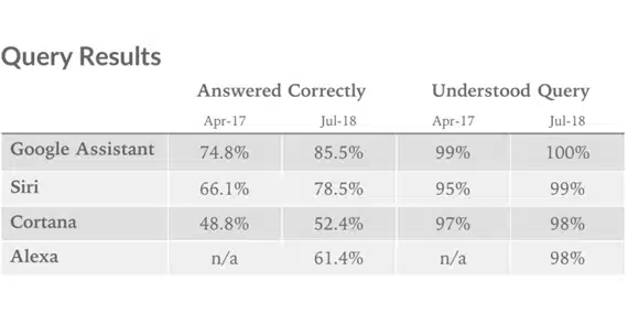 Τα συμπεράσματα που βγήκαν από το τεστ είναι πολλά, με τον τομέα των σωστών απαντήσεων να παρουσιάζει βελτίωση σε όλους τους ψηφιακούς βοηθούς, με τη Siri να παρουσιάζεται βελτιωμένη μιας και από το 66.1% των σωστών απαντήσεων ανέβηκε στο 78.5%, αλλά το Google Assistant παρέμεινε στην κορυφή μιας και αυτό παρουσίασε σημαντική βελτίωση μιας και απάντησε σωστά στο 85.5% των ερωτήσεων, από το 74.8% του 2017.