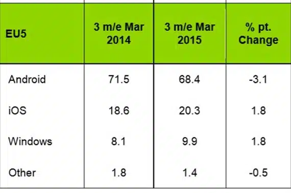 Σύμφωνα με τα στοιχεία της εταιρείας ερευνών Kantar, για το πρώτο τρίμηνο του 2015 το Windows Phone ανέβασε τα ποσοστά του στην ευρωπαϊκή αγορά. Το mobile OS της Microsoft έδειξε μια αύξηση της τάξης του 1.8, ποσοστό που από μόνο του δεν φαίνεται εντυπωσιακό, αλλά το iOS της Apple έχει ακριβώς την ίδια άνοδο.