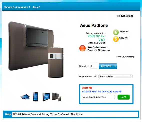 Ηλεκτρονικό κατάστημα της Αγγλίας έδωσε πρώτη τιμή για το ASUS Padfone τα 700 ευρώ. Το πακέτο που προτείνει σε αυτή την τιμή είναι το κινητό με το tablet και απο αυτό απουσιάζει το πληκτρολόγιο που ολοκληρώνει το concept του ASUS Padfone. Σε καμία περίπτωση δεν μπορούμε να γνωρίζουμε αν αυτή θα είναι η τιμή του μιας και η ASUS δεν έχει προχωρήσει ακόμα σε επίσημες ανακοινώσεις.