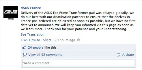 Οι πληροφορίες επιβεβαιώθηκαν (δυσυχώς) και μέσα από το επίσημο Fan Page της ASUS Γαλλίας μάθαμε ότι παγώνει η κυκλοφορία παγκοσμίως του tablet ASUS Transformer Prime μέχρι νεοτέρας. Κάποια ελάχιστα κομμάτια που είχαν γίνει προπαραγγελία μαθαίνουμε ότι παραδίδονται σιγά σιγά στην Αμερική, τίποτε άλλο όμως πιο ενθαρυντικό.