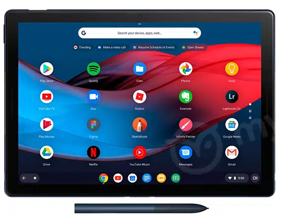 Αναφορικά με το αποσπώμενο πληκτρολόγιο, αυτό δείχνει να έχει στρογγυλά πλήκτρα και touchpad και οι χρήστες θα μπορούν να το “κουμπώνουν” στην οθόνη μέσω των pin connector. Επιπλέον, δείχνει να διαθέτει πλήκτρο το οποίο ενεργοποιεί το Google Assistant με το πάνω μέρος του πληκτρολογίο να χρησιμοποείται για την τοποθέτηση του tablet το οποίο θα κλείνει και θα μετατρέπεται σε laptop.
