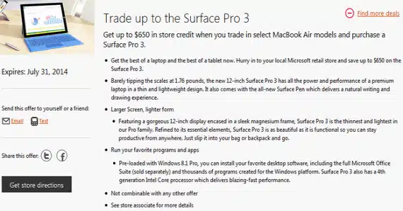Το Microsoft Surface Pro 3 είναι πολύ δυνατό 12-ιντσο tablet το οποίο έχει σχεδιαστεί να κάνει σχεδόν τα πάντα και όπως είχε πει και η ίδια η Microsoft κατά την παρουσίασή του στοχεύει να αντικαταστήσει τo laptop. Tα Surface Pro 3 ξεκινάνε από $799 (64GB Intel i3) και φτάνουν μέχρι $1949 (512GB, Intel i7) όμως η Microsoft δίνει τη δυνατότητα να έχετε πάνω από $650 έκπτωση εάν δώσετε το MacBook Air σας.