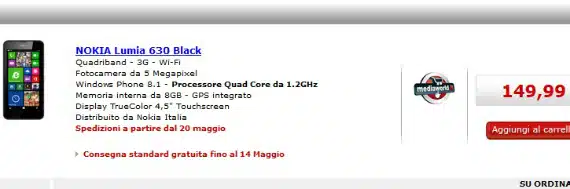 Ενώ όπως είπαμε εχθές η Microsoft θα ξεκινήσει την υποστήριξη του Windows Phone 8.1 update στις 24 Ιουνίου, μάλλον η πρώτη συσκευή με Windows Phone 8.1 θα κυκλοφορήσει πολύ νωρίτερα. Μιλάμε για το Nokia Lumia 630 το οποίο είναι διαθέσιμο για προ-παραγγελίες στην Ιταλία με τιμή στα €149.99.