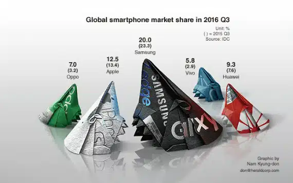Σύμφωνα με μια νέα αναφορά από την IDC, η Samsung κατά την διάρκεια του τρίτου τριμήνου του 2016, σημείωσε πτώση στο παγκόσμιο μερίδιο αγοράς των smartphone.